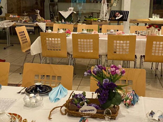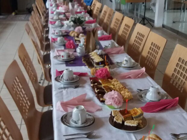 60 Frauen konnten begrüßt werden. Sie nahmen an langen Tafeln Platz. Diese waren liebevoll gedeckt und kunstvoll dekoriert. Die LandFrauen boten selbstgebackenen Kuchen an.