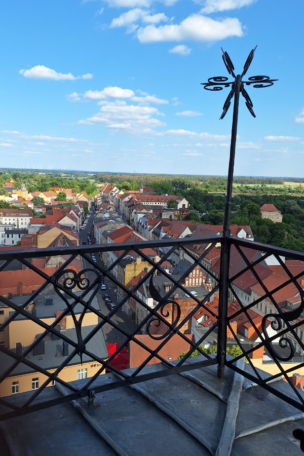 Die Türmerwohnung ist authentisch eingerichtet: Stube, Küche, Turmuhr, Glockenmechanik – inklusive Feuerflagge, mit der im Mittelalter Brände signalisiert wurden. Ein Highlight ist der Rundblick über Wittenberg – bei klarem Wetter reicht die Sicht weit über die Altstadt hinaus, ein herrlicher Skyline–Ausblick. Zusätzlich, zur Besichtigung der Wohnung, erhielten die Landfrauen einen Einblick in das Glockenwerk.