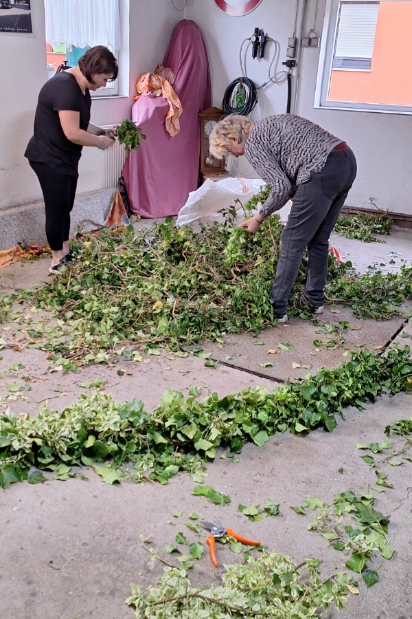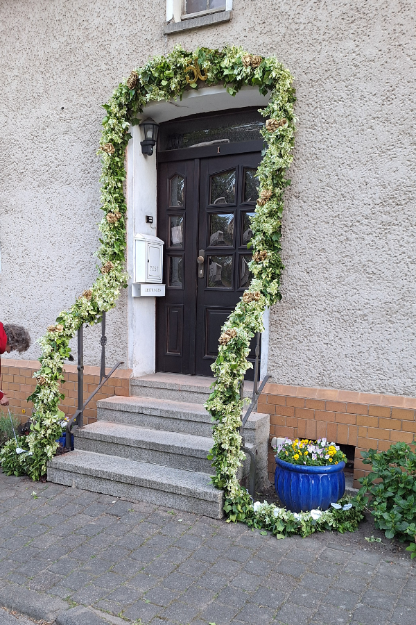 Der Ortsverein Fläming lud zu einem Workshop ein, der sich mit Dekoration aus Naturmaterialien beschäftigte. Im ersten Teil der Veranstaltung erhielten die Frauen einen Einblick in das Binden einer Türgirlande. Gemeinsam wurde eine Türgirlande zu einer goldenen Hochzeit gebunden, aus üppig wachsendem Efeu. Die Referentin Uta Höhne leitete die Teilnehmerinnen an.