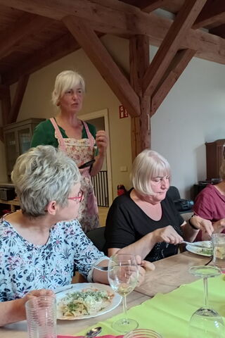 Frau Simonsen erläuterte sehr kurzweilig, wie die mediterranen Speisen auf südländische Art genossen werden - in mehreren kleinen Gängen und mit viel Zeit. Zwischendurch erfuhren die Teilnehmerinnen Wissenswertes über die Weinrebe, der Heilpflanze des Jahres 2023, welche gute Vitalstoffe sich mitbringt und dass sie mit all ihren Teilen, Reben, Blättern, Trauben, Saft, Wein zu unserem Essen unser Leben bereichert.