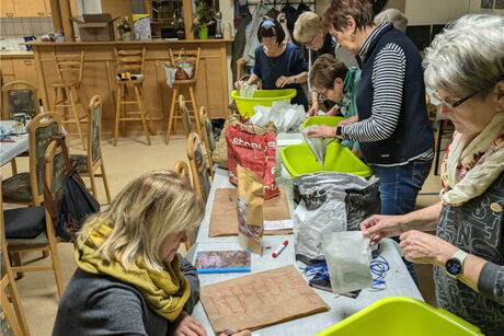 Anschließend stellten die Landfrauen unter Anleitung von Frau Simonsen eigene Teemischungen zusammen. Dabei wurde die Wirkrichtung berücksichtigt, d.h. es wurde überlegt, welche Kräuter für welchen Tee passen. Die Referentin brachte eine große Auswahl an Kräutern mit und es gab auch die Möglichkeit der Teeverkostung. Für die weitere Zusammenstellung des Tees trennten die Teilnehmerinnen die Blätter und Blüten von den Stängeln, schnitten bzw. kräuselten diese für die Zusammenstellung des Tees. Alles wurde schön vermengt und in Beutel abgefüllt. Liebevoll wurden diese beschriftet, teilweise mit Namen versehen, z.B. „Frühjahrstee“ oder „Glückstee“.