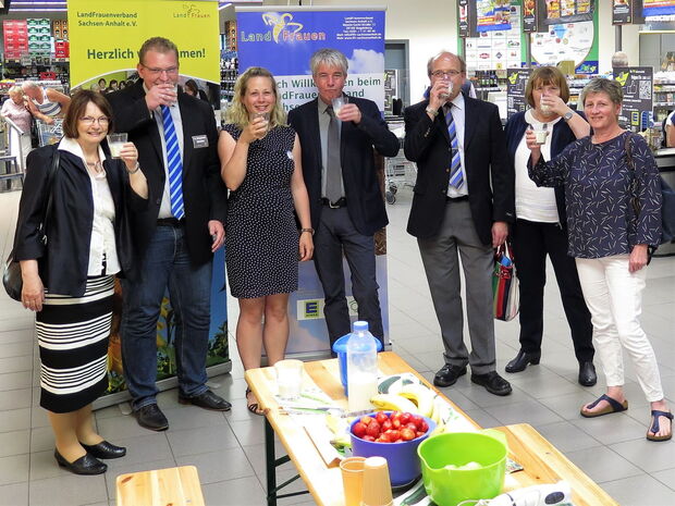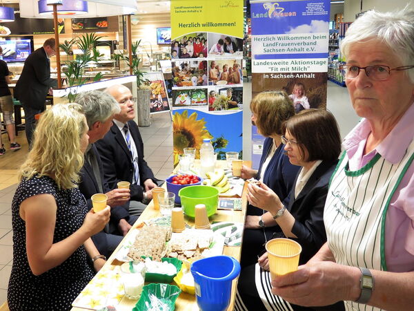 Der Projektstart „Fit mit Milch“ des LandFrauenverbandes Sachsen-Anhalt e.V. fand dieses Jahr in Halle statt. Am 1. Juni, dem internationalen Tag der Milch, drehte sich wieder alles um die Milch – von Verkostungen bis hin zu Wissenswertem. Schmeckt z. B. Milch hohem Fettgehalt anders als niedrigem? Wo ist der Unterschied zwischen frischer und haltbarer Milch? Diese und weitere Fragen wurden Weise beantwortet. Eröffnet wurde die Veranstaltung von Staatssekretär Dr. Ralf-Peter Weber. Auch Sachsen-Anhalts Milchkönigin Nancy I. folgte der Einladung des LandFrauenverbandes und Marktleiter Steven Wienskowski und stattete dem EDEKA Center in Halle im Hermes-Areal einen Besuch ab.