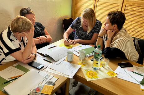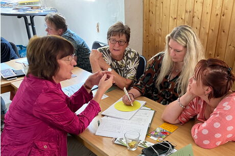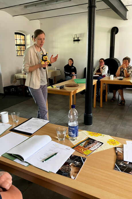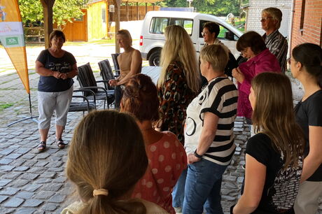 Alle Teilnehmenden notierten ihre erste Vision ihres bauernhofpädagogischen Angebotes, um es nach der Schulung anzupassen und weiterzuentwickeln. Danach erklärte Frau Fischer, immer im Austausch mit den Teilnehmenden, was Bauernhofpädagogik ist, was sie leisten kann und welche Ansätze sie umfasst. Anschließend erläuterte sie, welche Inhalte die Schulstunde enthält und wie diese methodisch gestaltet werden kann. In einer kleinen Gruppenarbeit erschlossen sich die Bauernpat*innen, wie sie Kinder zum Mitmachen animieren können. Anschließend zeigte die Referentin auf, wie eine Hofführung aufgebaut sein kann und welche methodischen Mittel es gibt, diese kindgerecht durchzuführen. Auch eine Einführung in die wichtigen Hygienegrundlagen sowie Versicherungsfragen gab es.