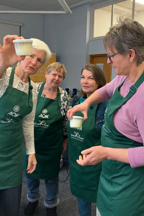 Der praktische Teil wurde von LandFrau Christin Simonsen (Ernährungsberaterin für Kinder) gestaltet. Sie ist ebenfalls schon viele Jahre als LandFrau im Rahmen dieses Projektes in Kitas unterwegs. Ihr umfangreiches Wissen und ihre Erfahrungen gab sie in der Schulung weiter. Sie zeigte den Teilnehmerinnen, wie ein Einsatz für ein „Gesundes Frühstück in Kitas“ bestmöglich vorbereitet wird und wie dieser inhaltlich gestaltetet werden kann. Gemeinsam bereitete sie mit den Schulungsteilnehmerinnen ein „Gesundes Frühstück“ zu. In Gruppenarbeit wurde zum Beispiel Obst und Gemüse geschnitten. Die Herstellung von Butter, auch „Butter schütteln“ genannt, bringt viel Freude und Erstaunen. Anschließend legten alle Teilnehmerinnen gemeinsam Brotgesichter. Frau Simonsen erläuterte, die kindgerechte Zubereitung eines leckeren und gesunden Frühstücks und wie zum Mitmachen animiert werden kann.