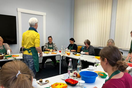 Der praktische Teil wurde von LandFrau Christin Simonsen (Ernährungsberaterin für Kinder) gestaltet. Sie ist ebenfalls schon viele Jahre als LandFrau im Rahmen dieses Projektes in Kitas unterwegs. Ihr umfangreiches Wissen und ihre Erfahrungen gab sie in dieser Schulung weiter. Sie zeigte den Teilnehmerinnen, wie ein Einsatz für ein „Gesundes Frühstück in Kitas“ bestmöglich vorbereitet wird und wie dieser inhaltlich gestaltetet werden kann. Gemeinsam bereitete sie mit allen Teilnehmerinnen ein „Gesundes Frühstück“ zu. So wurde Obst und Gemüse geschnitten, Butter geschüttelt, Brotgesichter gelegt und Frau Simonsen erläuterte, wie dies kindgerecht erklärt und wie zum Mitmachen animiert werden kann. Die Teilnehmerinnen lernten auch, wie sie kindgerecht die Ernährungspyramide vermitteln.