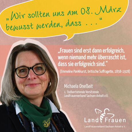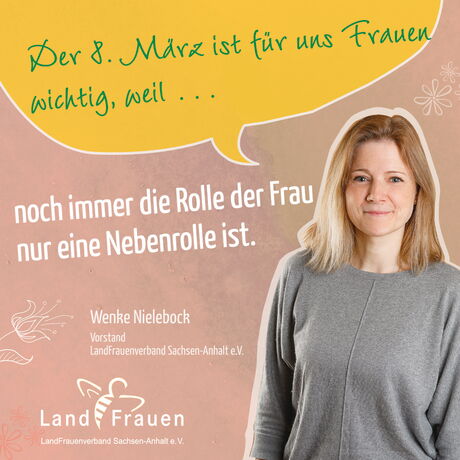 "Der Deutsche LandFrauenverband und somit auch wir LandFrauen in Sachsen-Anhalt setzen uns immer wieder mit Themen, wie der Forderung nach gleichen, fairen Löhnen; familienfreundlichen Arbeitsbedingungen oder auch Gewalt gegen Frauen auseinander. In unserer heutigen Gesellschaft werden diese und auch andere Themen der Gleichberechtigung immer noch deutlich.
