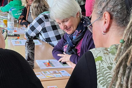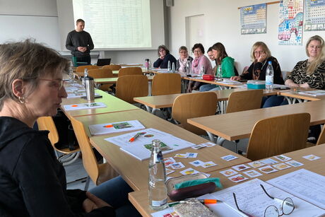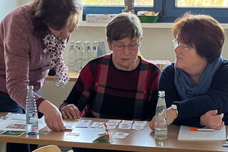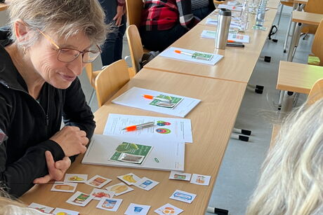 Als praktische Übung sollten die Teilnehmerinnen in Kleingruppen einen nachhaltigen Einkauf im Winter durchführen. Hier gab es einzelne Lebensmittel auf Kärtchen und die Gruppen stellten nach Präferenz und nachhaltigen Gesichtspunkten ihren Einkauf zusammen. Anschließend werteten wir gemeinsam den Einkauf aus. Herr Müller zeigte die Klimabilanz der einzelnen Produkte auf sowie Alternativen hierzu.