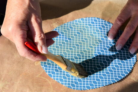 Pinseln Sie das flüssige Wachs auf den Stoff, so dass alle Stellen bedeckt sind.