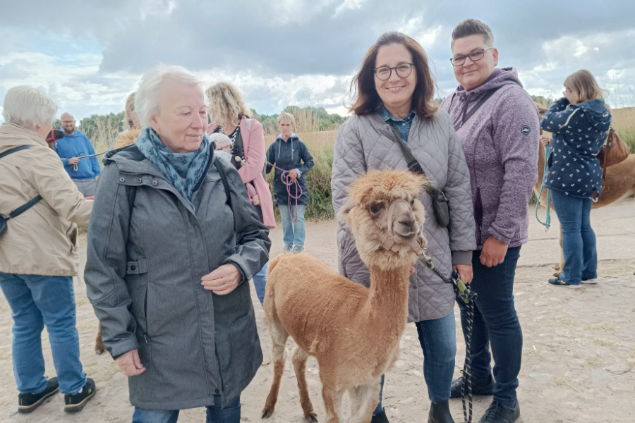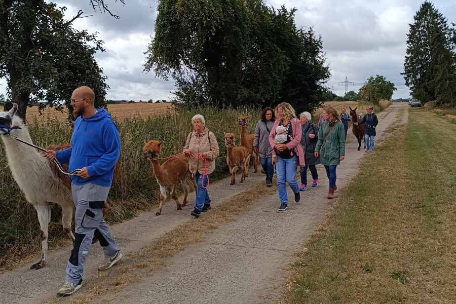 Im Anschluss an einen lehrreichen Vortrag über die Haltung von Alpakas, wanderten die Teilnehmerinnen mit den Alpakas und 2 Lamas durch die Umgebung von Berge. Hier erfuhren die Landfrauen, dass Alpakas in der Altmark neben der Nutzung zur Gewinnung der Wolle auch für therapeutische Zwecke genutzt werden. Während der Wanderung konnte die Gruppe außerdem entspannen und sich austauschen.