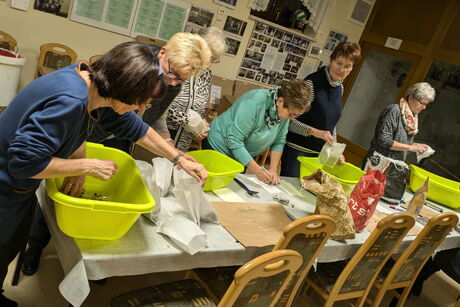 Anschließend stellten die Landfrauen unter Anleitung von Frau Simonsen eigene Teemischungen zusammen. Dabei wurde die Wirkrichtung berücksichtigt, d.h. es wurde überlegt, welche Kräuter für welchen Tee passen. Die Referentin brachte eine große Auswahl an Kräutern mit und es gab auch die Möglichkeit der Teeverkostung. Für die weitere Zusammenstellung des Tees trennten die Teilnehmerinnen die Blätter und Blüten von den Stängeln, schnitten bzw. kräuselten diese für die Zusammenstellung des Tees. Alles wurde schön vermengt und in Beutel abgefüllt. Liebevoll wurden diese beschriftet, teilweise mit Namen versehen, z.B. „Frühjahrstee“ oder „Glückstee“.