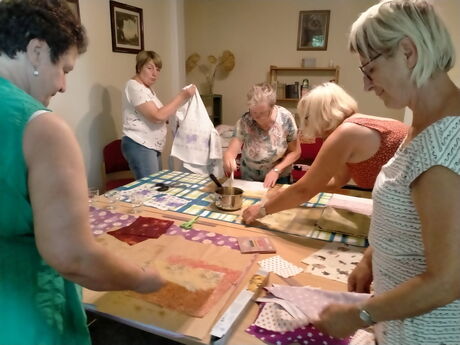 Der Treff im Pfarrhaus ähnelte an dem Tag einer Schneiderei. Es wurden viele bunte Baumwollstoffe ausgebreitet, die die Teilnehmerinnen zum Beispiel aus alter Aussteuer-Reserve mitbrachten. Scheren, Bügelbretter und Bügeleisen standen bereit. Ein Duft von Honig und warmen Bienenwachs zog durch das ganze Haus.