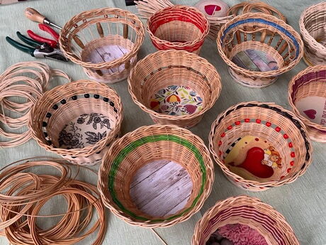 Die Korbböden waren bereits von der Leiterin mit schönen Motiven gestaltet und somit auch abwischbar. Jede wählte einen Korbboden aus und schon konnte es losgehen. Unter der guten Anleitung war jede mit Begeisterung dabei und es entstanden unter den fleißigen Händen sehr unterschiedliche Körbe. Zum Schluss präsentierten wir auf einem Foto mit Stolz unsere selbstgebastelten Werke.