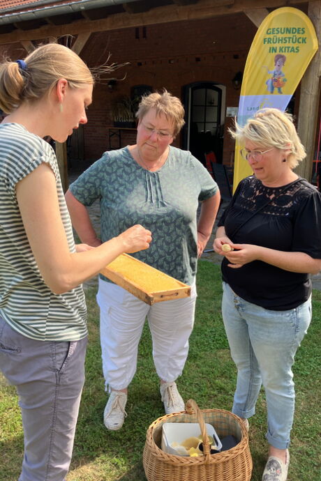 Die Netzwerkkoordinatorin Prävention der AOK Sachsen-Anhalt, Katharina Winkler, durften wir ebenfalls begrüßen. Sie konnte mit neuen Bauernpat*innen in den Austausch gehen und nicht nur die neuen Projektteilnehmenden kennenlernen, sondern sich ebenfalls ein Bild über die Höfe und die zukünftigen Hofführungen machen. Auch mit den Projektteilnehmenden, welche schon länger im Projekt sind, ist ein regelmäßiger persönlicher Austausch wichtig. Frau Winkler erläuterte die Homepage www.deine-gesundheitswelt.de/kinderprojekte und stellte fest, dass eine gesunde Lebensführung und die Wertschätzung für Lebensmittel am besten auf dem Hof greifbar und erlebbar werden.