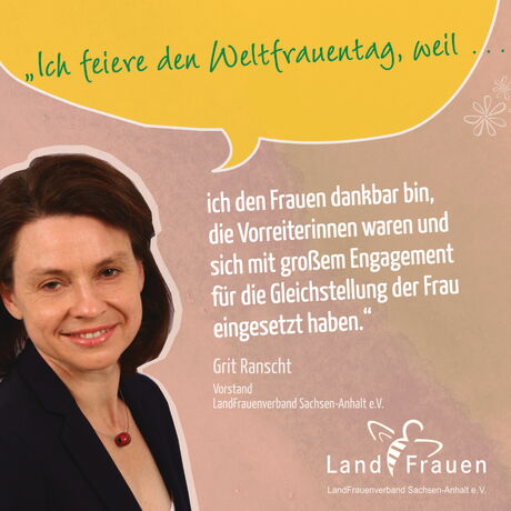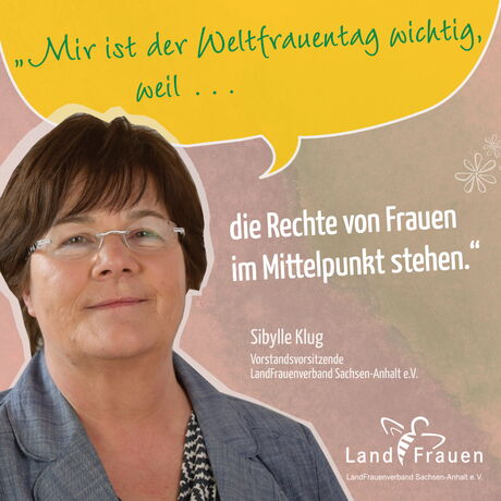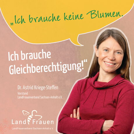 "Der Deutsche LandFrauenverband und somit auch wir LandFrauen in Sachsen-Anhalt setzen uns immer wieder mit Themen, wie der Forderung nach gleichen, fairen Löhnen; familienfreundlichen Arbeitsbedingungen oder auch Gewalt gegen Frauen auseinander. In unserer heutigen Gesellschaft werden diese und auch andere Themen der Gleichberechtigung immer noch deutlich.