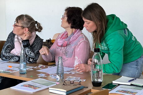 Als praktische Übung sollten die Teilnehmerinnen in Kleingruppen einen nachhaltigen Einkauf im Winter durchführen. Hier gab es einzelne Lebensmittel auf Kärtchen und die Gruppen stellten nach Präferenz und nachhaltigen Gesichtspunkten ihren Einkauf zusammen. Anschließend werteten wir gemeinsam den Einkauf aus. Herr Müller zeigte die Klimabilanz der einzelnen Produkte auf sowie Alternativen hierzu.