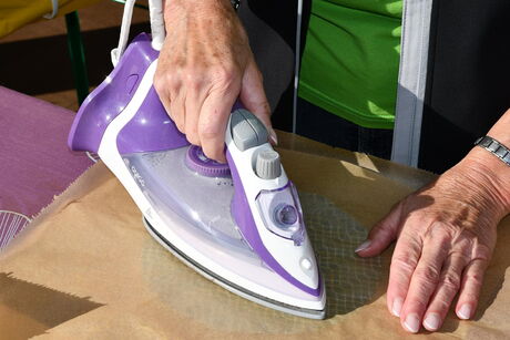 Legen Sie eine zweite Schicht Backpapier darüber. Bügeln Sie auf höchster Stufe gleichmäßig hin und her, bis das flüssige Wachs überall auf dem Tuch verteilt ist.